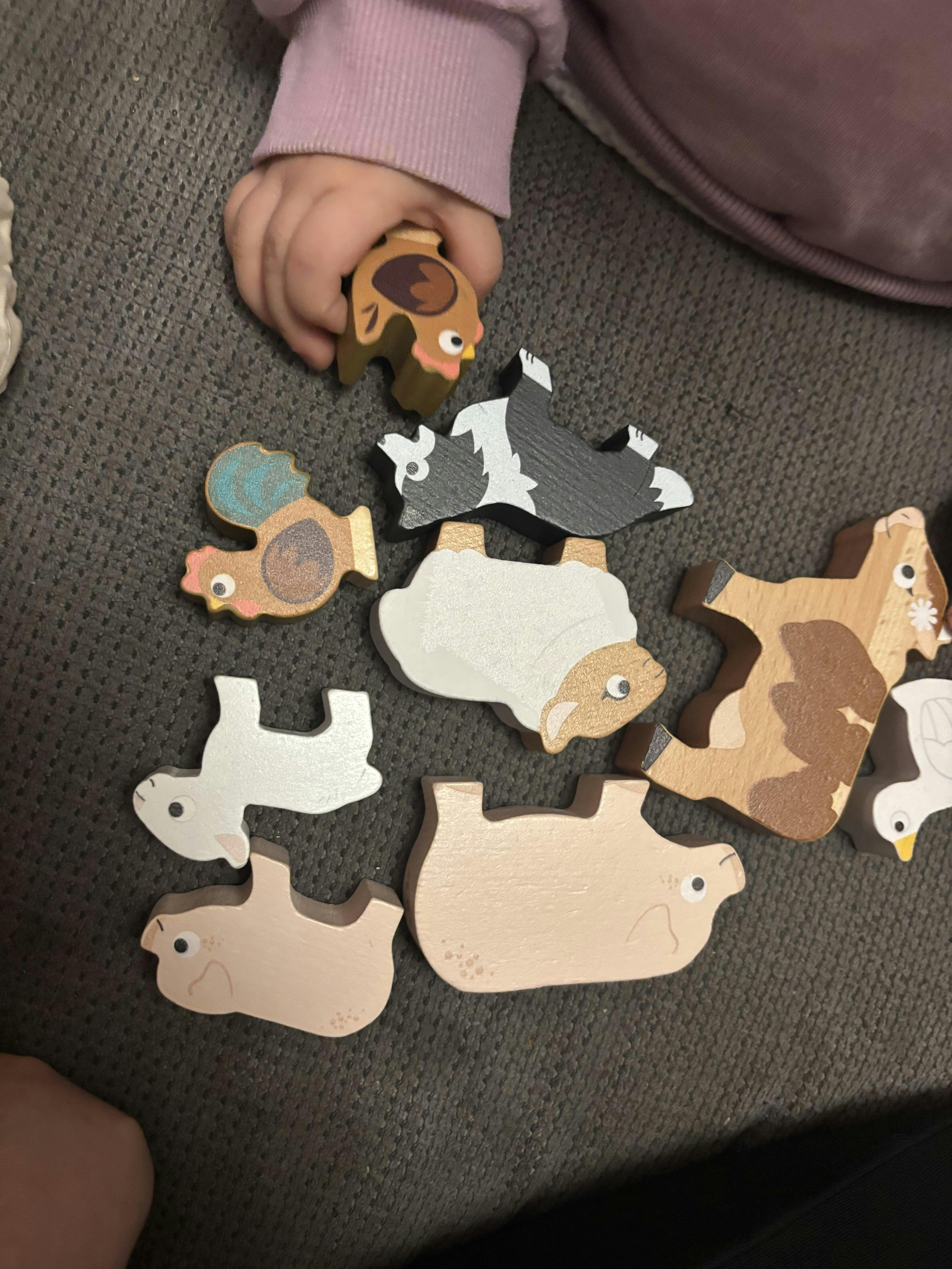Il comprend 9 animaux de la ferme en bois, livrés avec un petit sac en coton imprimé pour les ranger facilement et les emporter partout !