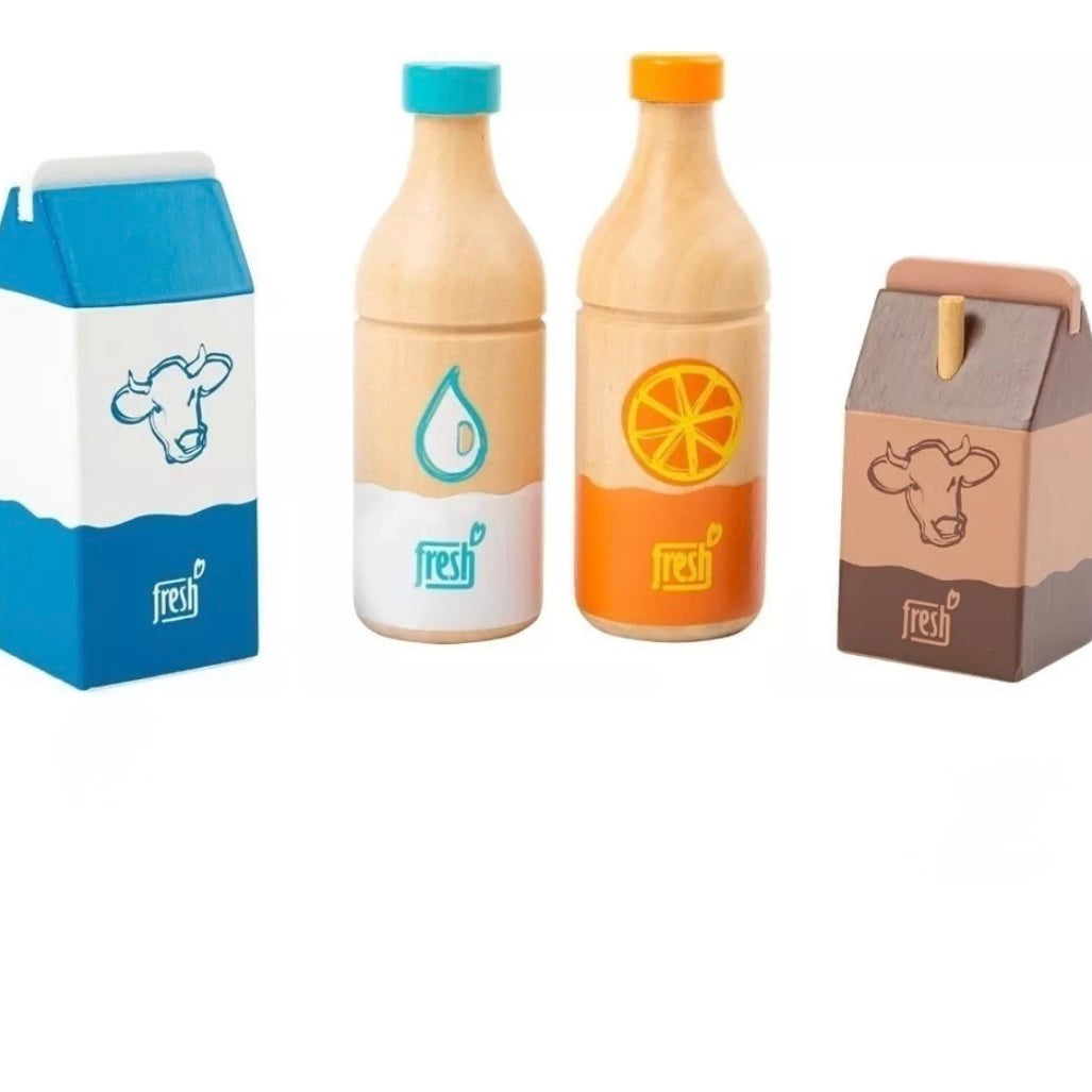 Quatre désaltérants dans un seul coffret ! Cet ensemble de boissons en bois de quatre pièces comprend une bouteille de jus d'orange, une bouteille d'eau, une brique de lait et un petit paquet de cacao. Conçus avec des illustrations faciles à comprendre, ils sont parfaits pour les jeunes enfants qui ne savent pas encore lire. Un complément idéal aux épiceries et aux cuisines pour enfants ! Conçu dans des couleurs typiques du produit et avec une forte proportion de bois visible, cet ensemble de jeu a un aspect harmonieux et fait visuellement partie du groupe de produits « frais ».
