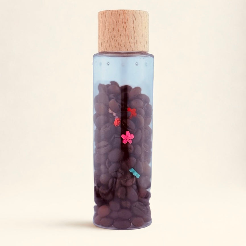 Remplie de vrais grains de café et de perles en forme de fleurs et de feuilles, cette bouteille est un univers miniature qui stimule la curiosité et l'imagination des enfants. 🍃L'odeur de café s'en émane suffisamment pour faire découvrir de nouveaux parfums à vos petits bouts.