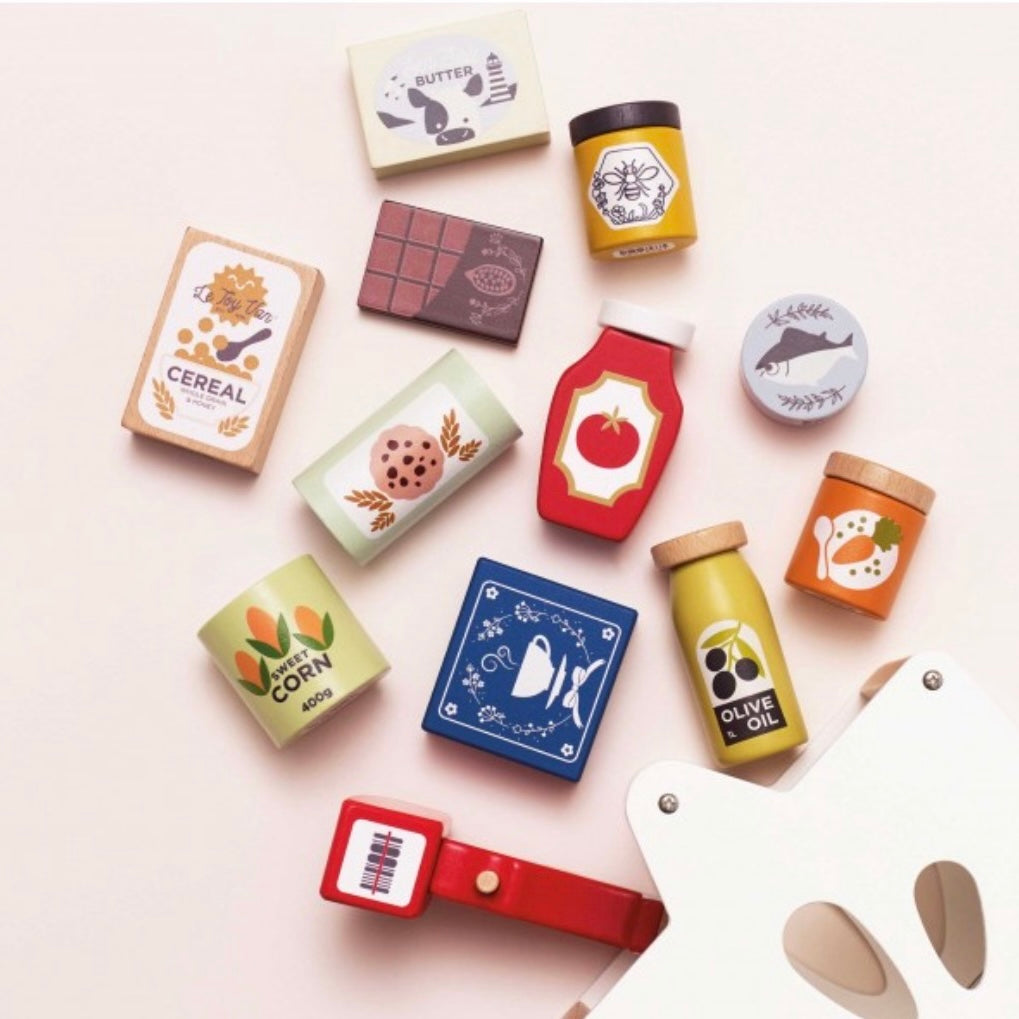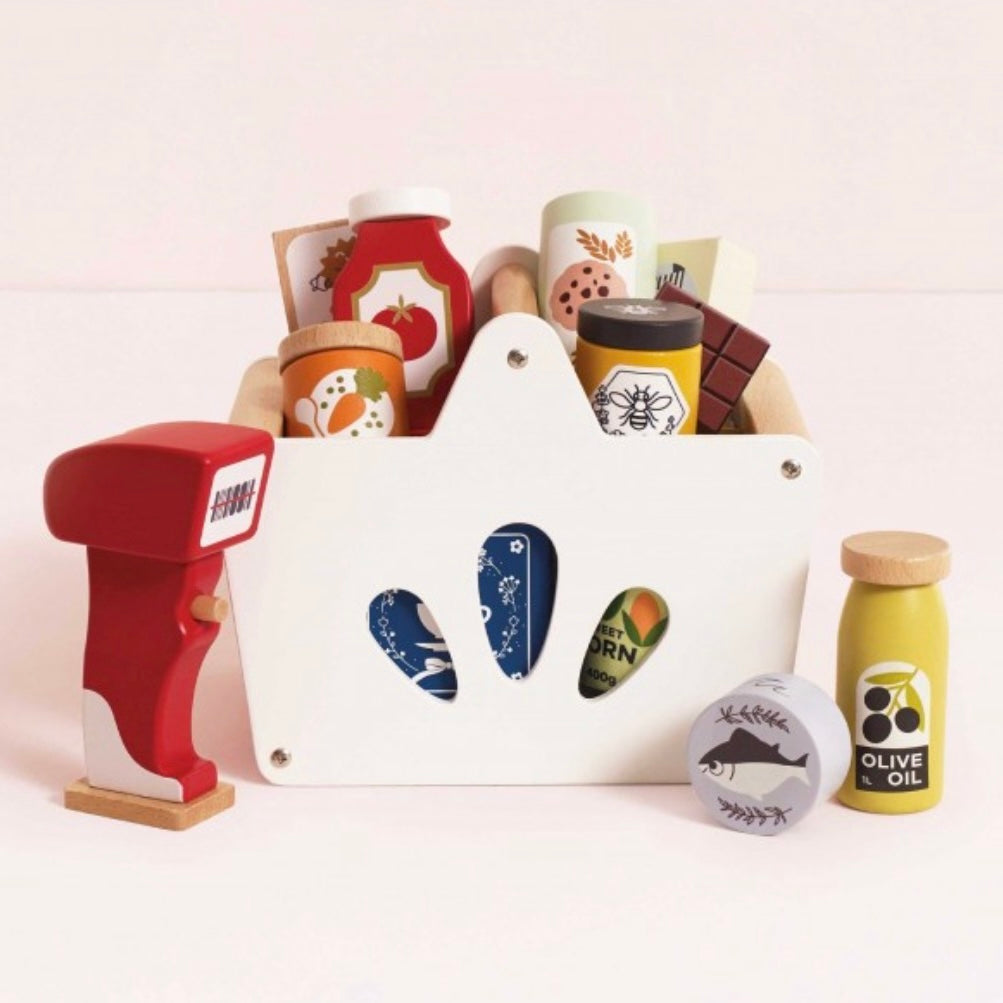 Tout le nécessaire pour faire les courses au supermarché comme les grands ! Ce set très complet comprend un panier en bois FSC™, plus d’une douzaine d’aliments en bois solide et un scanner avec ses autocollants codes-barres pour valider les achats.
