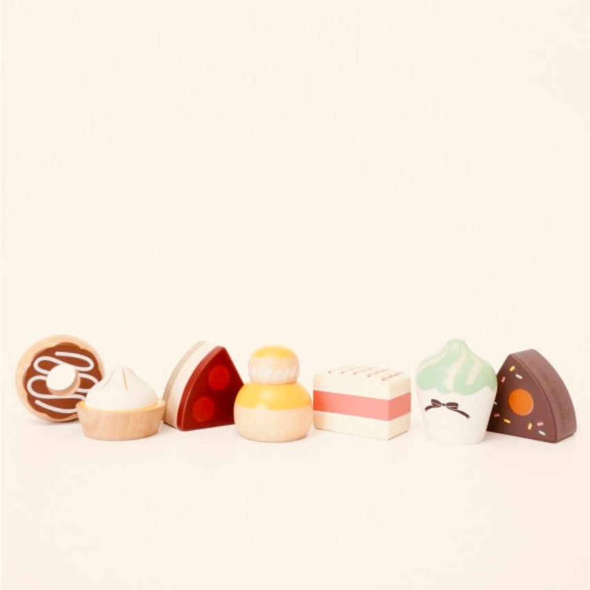 Un superbe présentoir à gâteaux à 3 étages en bois avec 7 douceurs : donut, tarte citron, gâteau à la framboise... Idéal pour les jeux d'imitation goûter d’anniversaire ou un salon de thé.