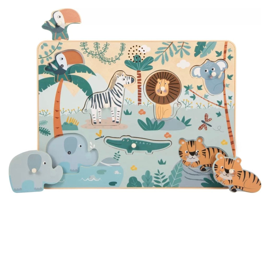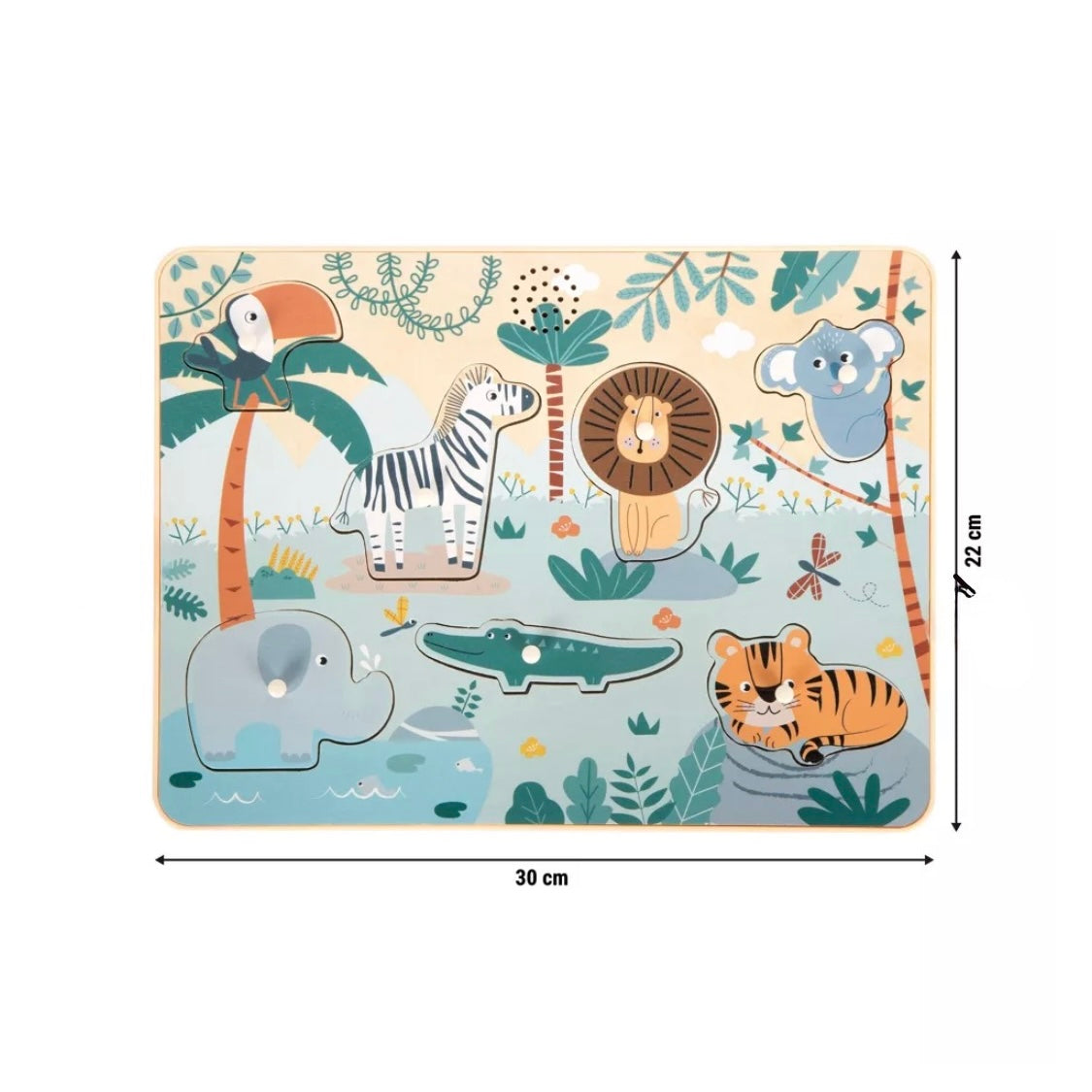Une expérience d'apprentissage acoustique pour les petits fans de puzzles ! Ce puzzle joliment illustré en bois certifié FSC® 100 % amène le monde passionnant du safari dans la chambre des enfants, y compris de vrais sons d'animaux. Lorsque les cinq pièces détaillées du puzzle sont soulevées, des sons d'animaux appropriés sont entendus, faisant sortir les yeux et les oreilles. La motricité, la concentration et la compréhension des relations de cause à effet sont favorisées de manière ludique. Le puzzle en bois impressionne par son design adapté aux enfants, ses motifs colorés et ses effets sonores passionnants. Les cinq animaux – lion, tigre, éléphant, crocodile et zèbre – s’insèrent exactement dans les recoins prévus à cet effet et émettent des sons d’animaux réalistes lorsqu’ils sont soulevés. Les grandes pièces de puzzle faciles à saisir sont idéales pour les mains des petits enfants et favorisent la coordination œil-main ainsi que la patience et la persévérance pendant le jeu. Grâce à une finition de haute qualité, des couleurs modernes et une forte proportion de bois, le puzzle devient un élément pédagogique précieux dans la chambre de l'enfant.