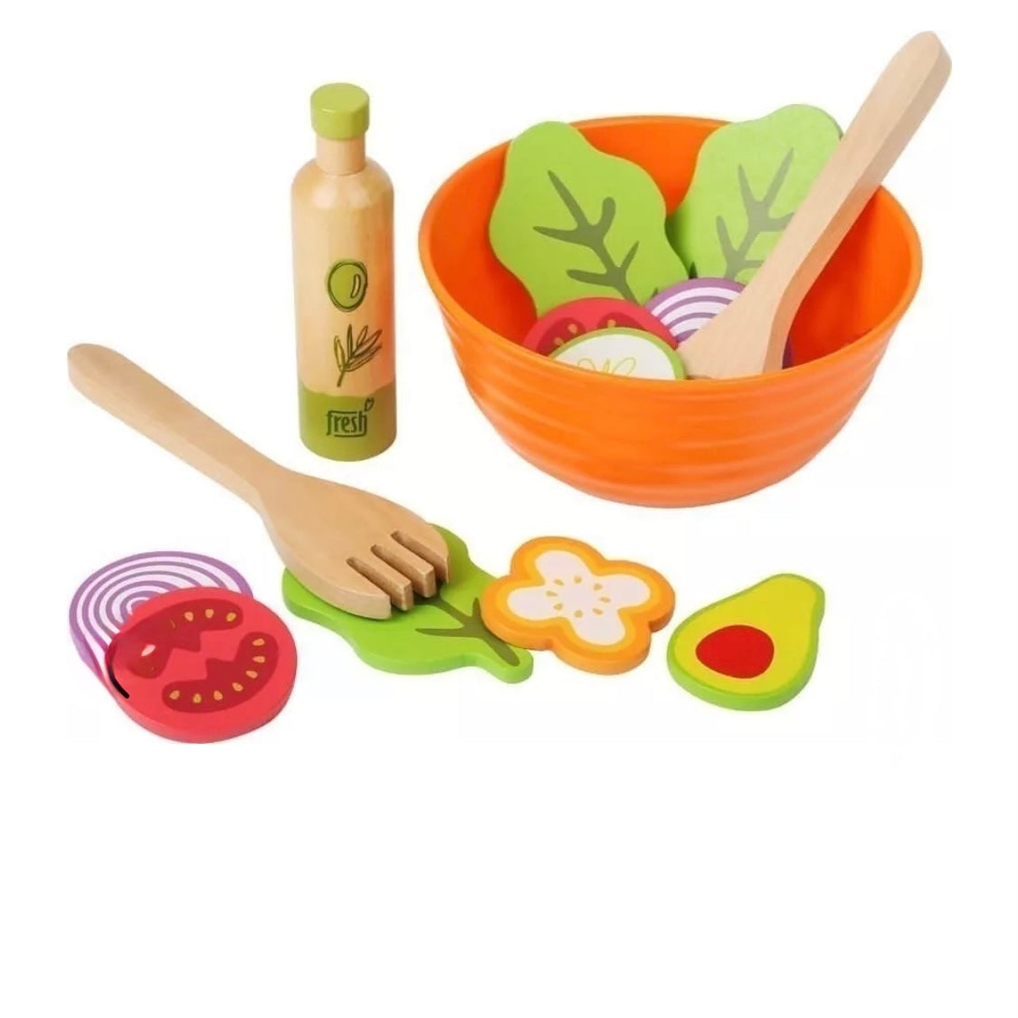 La salade du jour ! La tomate, l'oignon, l'avocat, la laitue, le concombre et l'huile d'olive sous forme de bois robuste ne devraient manquer dans aucune salade. De manière ludique, les enfants sont initiés à une alimentation saine grâce à des jeux de rôle. Ils peuvent assembler leurs propres créations dans un bol en plastique et remuer le tout avec les couverts en bois. Le complément parfait à toute cuisine ludique !