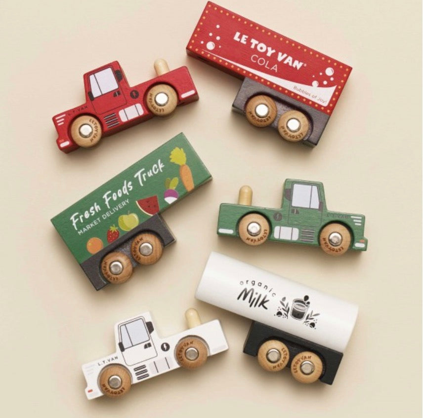 Prenez la route avec ce set de camions en bois FSC™ conçu pour des heures de jeu imaginatif. Il comprend trois camions : un camion de soda cola, un camion de fruit et légumes frais et un camion de lait bio, chacun doté d’une remorque amovible pour jouer de mille façons.